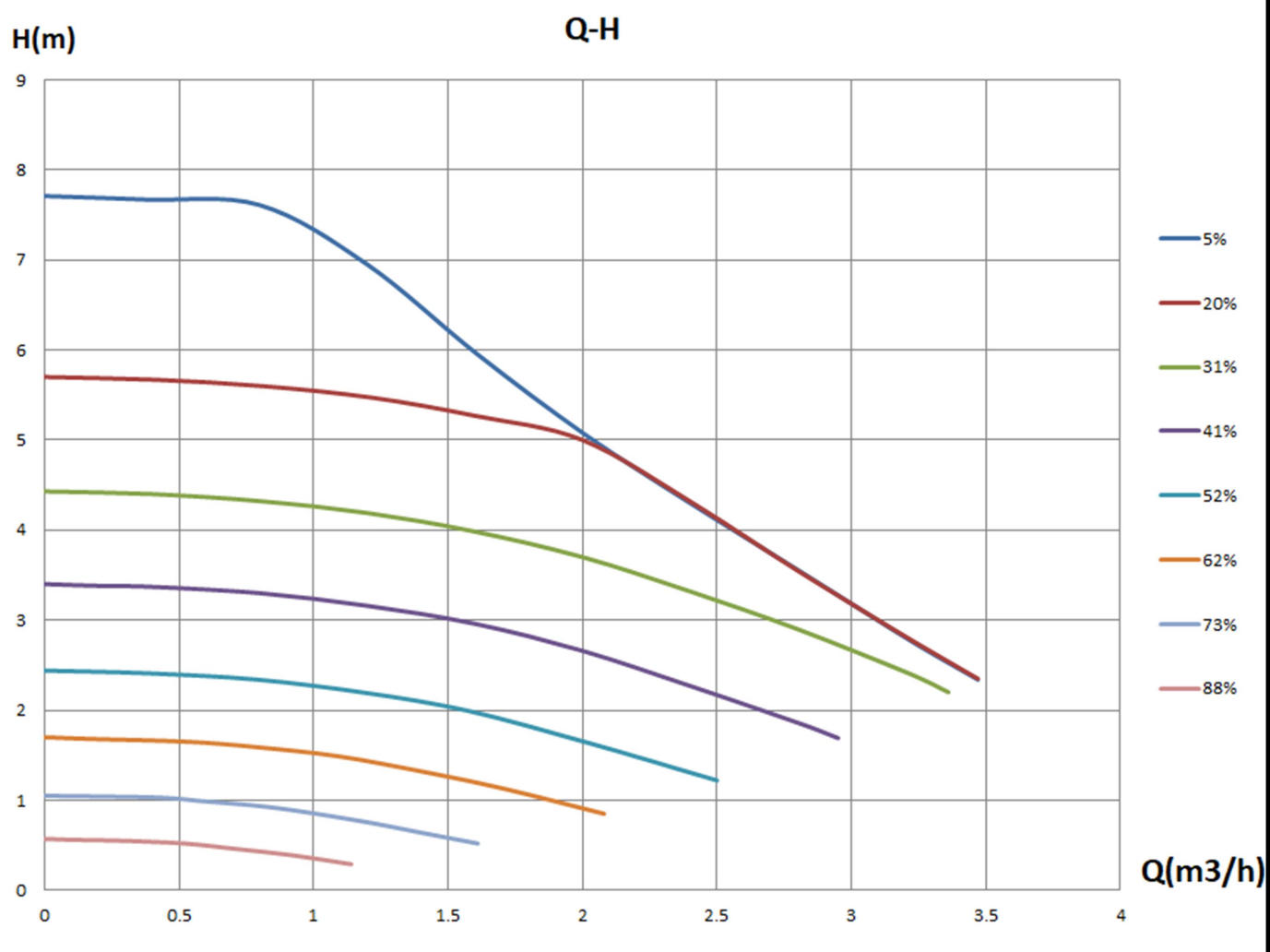 منحنى الأداء هذا مناسب للمياه ذات درجة الحرارة العادية، إذا تم استخدام المضخة لوسط غير مائي، سيتم تقليل الأداء الهيدروليكي للمضخة، لذلك، في اختيار المضخة، يجب النظر في خصائص الوسط السائل.